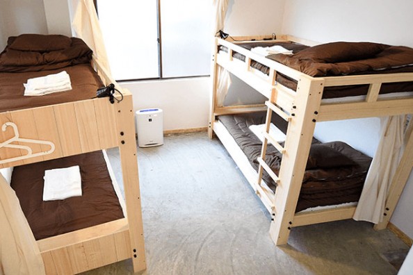 ヒノキの2段ベットが2台設置された、4名様1部屋のドミトリーが3部屋あります。共用シャワー・トイレはお部屋の中あります。
