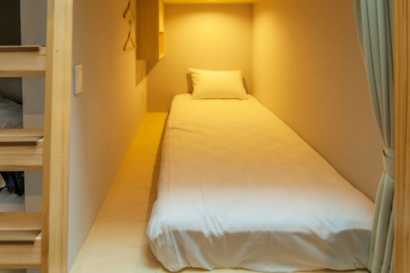 cup of teaのドミトリーは、プライバシーへ配慮したポッド型ベッドを採用しています。カプセルホテルよりも広い空間で、贅沢な時間をお過ごしください。