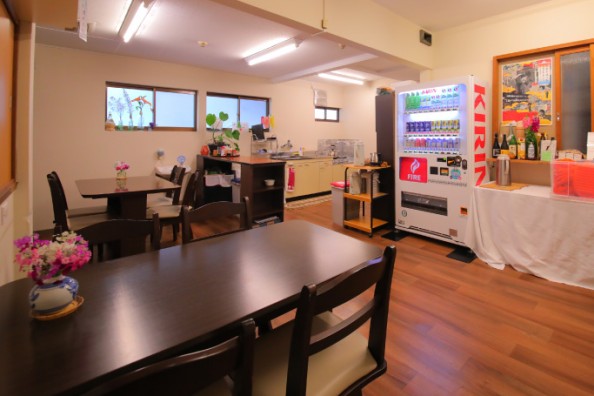 セルフサービスのコーヒー・紅茶・日本茶、共有の冷蔵庫、食器類が揃っております。またお飲み物の自動販売機を設置しておりますので好きな時にお好きなお飲み物をご購入頂けます。