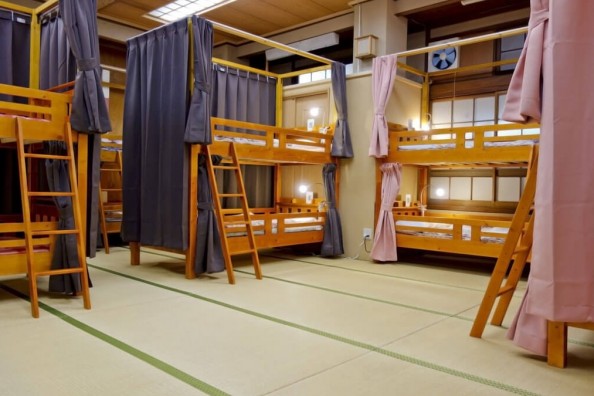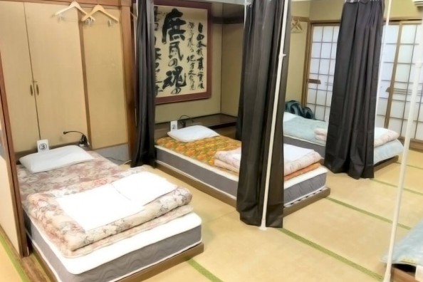 60平方メートル程度の和室を12名様で共用する男性専用のドミトリールームです。カーテン付きですので、プライベート空間を確保できます。