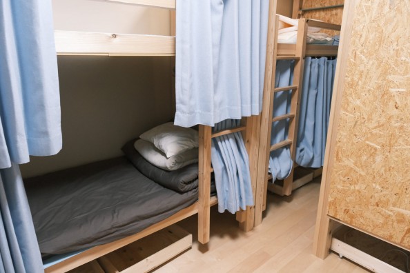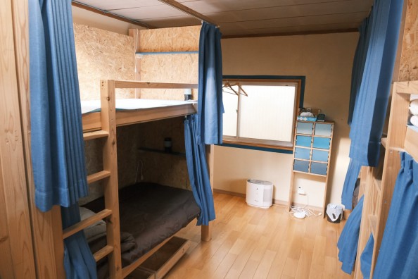 男女混合ドミトリーは通称「海の部屋」と呼ばれています。地元・宮古産の木材を使用して作られた二段ベッドでゆったりとお休みいただけます。こちらのお部屋は相部屋となりますが、仕切りとカーテンがついているので安心です。