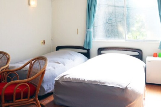 20平米ほどの広さのツインタイプのお部屋で、敷き布団を追加して最大3名様まで宿泊することが可能です。大きな窓がありますので明るい部屋でゆっくりとお寛ぎ頂けます。室内にはバス・トイレ・洗面所・テレビを完備。