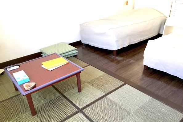 20平米ほどの大きさで畳スペースを設けた和洋ツインルームです。3名様でのご利用の場合は、お布団をご用意いたします。足を思いっきり伸ばしてくつろいだり、大きな荷物があっても広々とお使いいただけます。室内にはバス・トイレ・洗面所・テレビを完備しております。