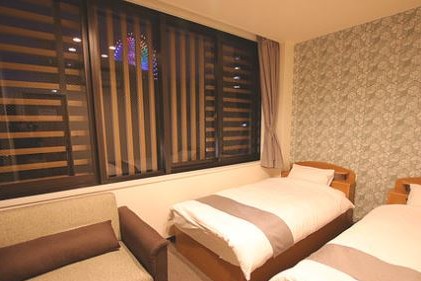 大きな窓から観覧車が見えるソファーベッド付きのツインルーム。2~3名まで利用でき、カップルやご家族での旅行におすすめのお部屋です。