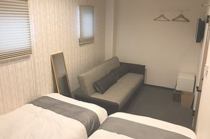 居心地の良いソファーベッド付きのツインルーム。ゆったりできるソファーの前にテレビが設置されていて、旅行の計画や一休みに最適なスペースとなってます。鏡もあり、部屋内は広いので荷物があってもちょうど良いスペースとなります。