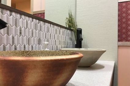 こじんまりとしたお食事処のようなエントランスの『GUEST HOUSE RICE』。中に入ると、オシャレなカウンターや待合室が現れ、受付をします。