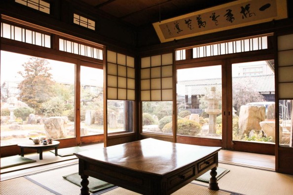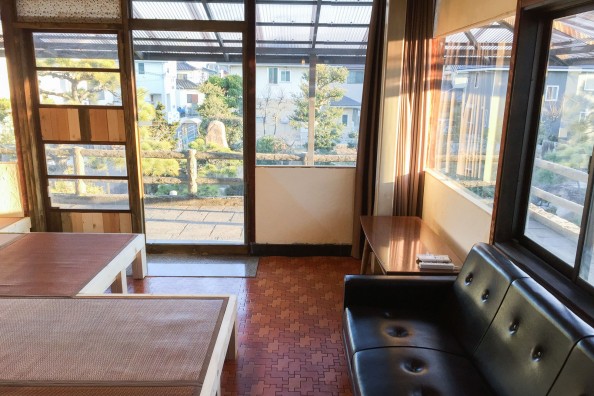 ガラス戸で囲まれた共有スペースの和室からは日本庭園を眺めることが出来ます。