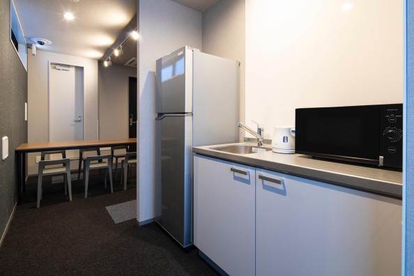共用キッチンには、電子レンジ・電気ポット・冷蔵庫を完備。