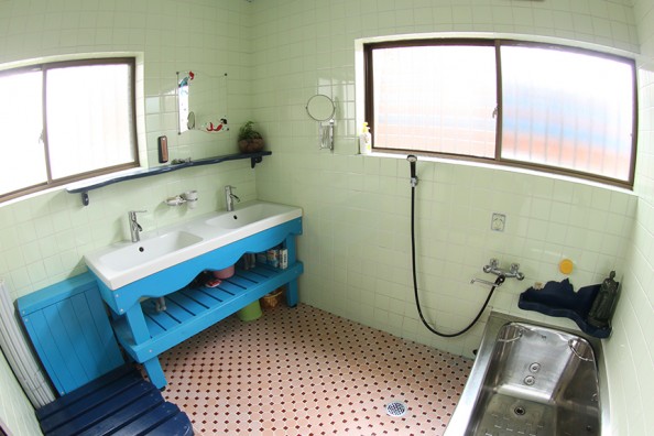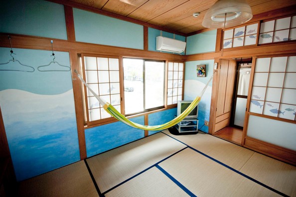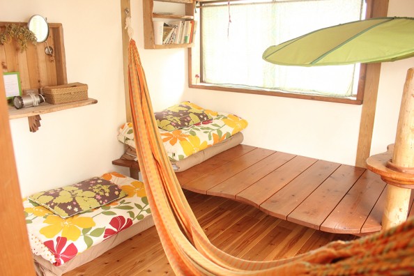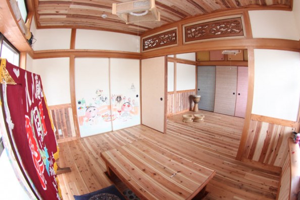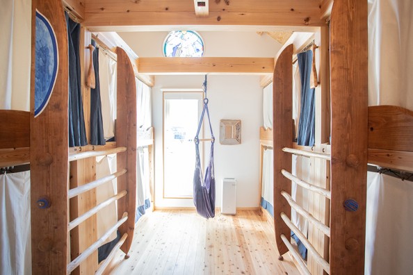 青と白の漆喰と土佐和紙を使い、かつおの群れが泳ぐ海の中をイメージ。ふすまを閉めると、かつおが回遊する仕掛けになっています。かつお神社や、ハンモック、絵本など、子どもも大人も楽しめます。ウッドデッキもベランダに作っているので、夏場はそこでビールも味わえますよ♪