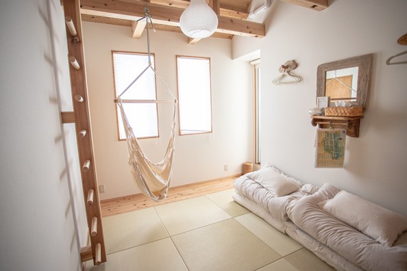 2018年8月にopenしたお部屋。ハンモックとロフトが付いた和室です。畳や和紙のブラインド、お月さまの取手、雲のハンガーかけ、手彫りの欄間など、ユニークな和室に仕上げています。