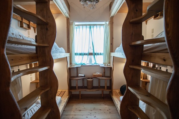 2018年8月にopenしたMIXドミトリー。2段ベッドの8人部屋です。ハンモックやサーフボードの階段、パドルのハンガー掛け、ココナッツの照明など全て手作りしました。夜はかつおのステンドグラスがとっても奇麗です♪
