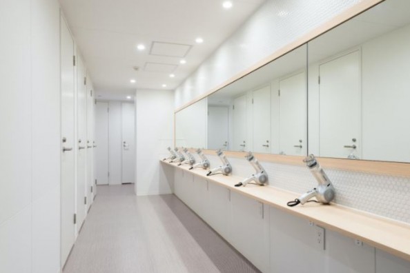 女性専用フロアのパウダールームは広々としており、快適にご利用頂けるよう洗面台が並ぶ箇所とヘアドライヤーが並ぶ箇所をご用意しております。人数が多くても用途別でご利用ができ、予定に遅れないようパウダールーム内に時計も設置しております。