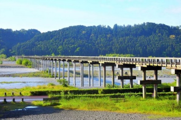 蓬萊橋(ほうらいばし)は、1879年(明治12年) に架けられた農業用の橋です。1997年(平成9年)12月30日に「世界最長の木造歩道橋」としてギネスブックに認定され、長さ「897.4m」ということから「やくなし」=「厄無し」、「長い木の橋」=「長生きの橋」と言われ、厄払いや長寿のパワースポットとして人気を集めています。