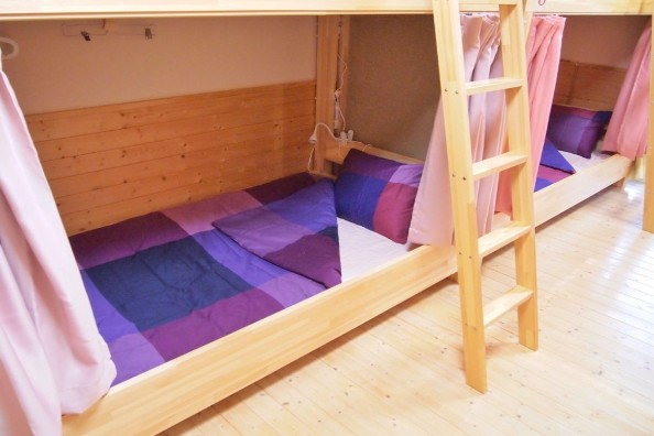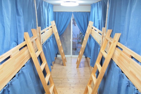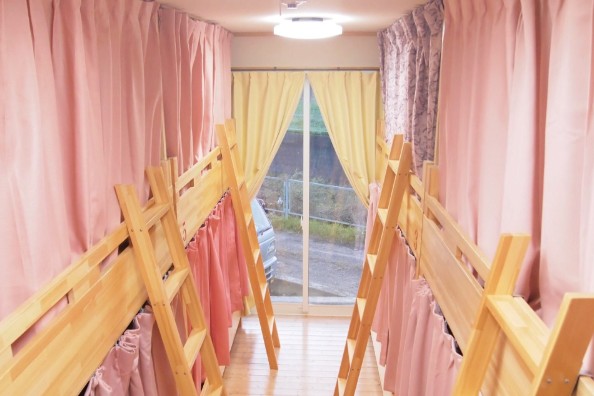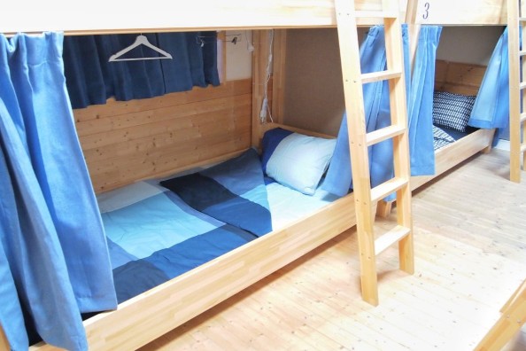 1室に2段ベッドが4つ置いている、ドミトリー(相部屋)です。木のぬくもりを感じられ、上下別々でカーテンがついているため、自分だけの空間でゆっくりとお休み頂けます。