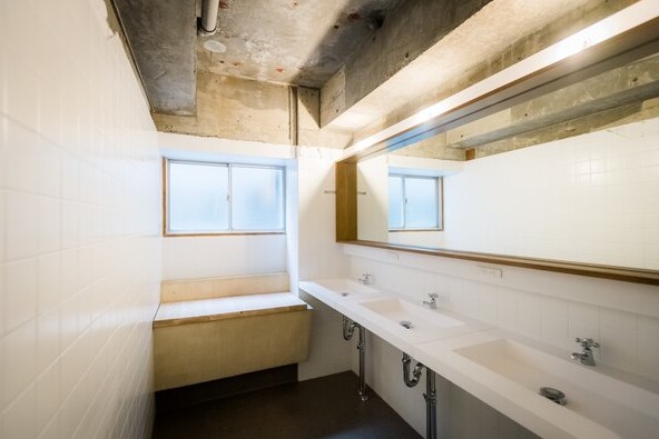 シャワールームの他、共用できる洗面台も完備しております。清潔感があり、ポーチやバッグなどの小物を置けるスペースも設けております。