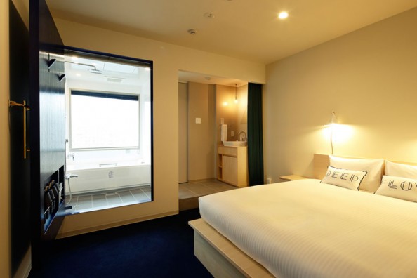こちらの個室にも、隅田川を臨むビューバスが付いており、開放的な入浴が楽しめます。室内にはエキストラベッド・ソファベッドを利用しており、最大4名まで宿泊可能です。広々としていますのでカップルやご家族、ご友人同士にもおすすめ。
