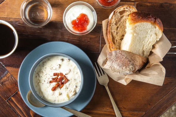 朝食はKIYOSUMI クラムチャウダーと季節のヴィーガンスープの2種類よりお選びいただけます。