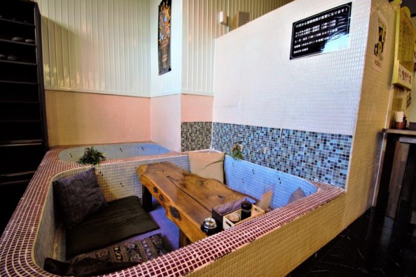 ゲストハウスの隣には、銭湯そのものを改装した地場産レストランを併設しています。当時の銭湯の雰囲気が色濃く残っており、湯舟の中で食事ができる変わったレストランです。